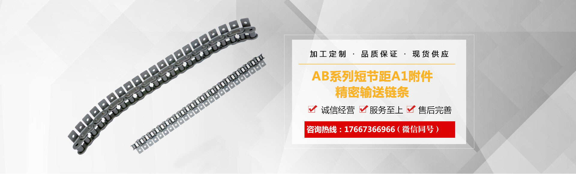 1、鏈條產(chǎn)品有各種不銹鋼、碳鋼輸送鏈條、雙節(jié)距輸送鏈條、空心銷(xiāo)軸鏈條、不銹鋼塑料平頂鏈、不銹鋼精密滾子鏈、特殊工礦輸送鏈、耐高溫輸送鏈條、非標(biāo)鏈條、彎板非標(biāo)鏈條、大節(jié)距輸送鏈條、各種鏈條用滾子(材質(zhì)碳鋼、不銹鋼)等。